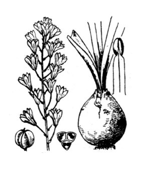 - Plante vivace de 20-50 cm, glabre, à bulbe gros, ovale, brun