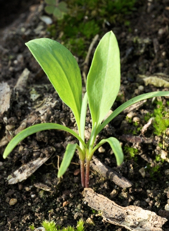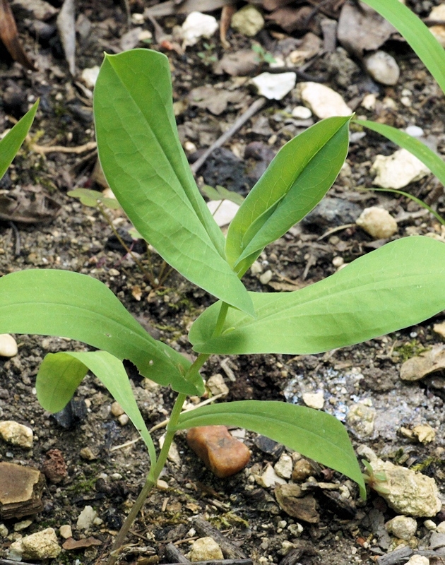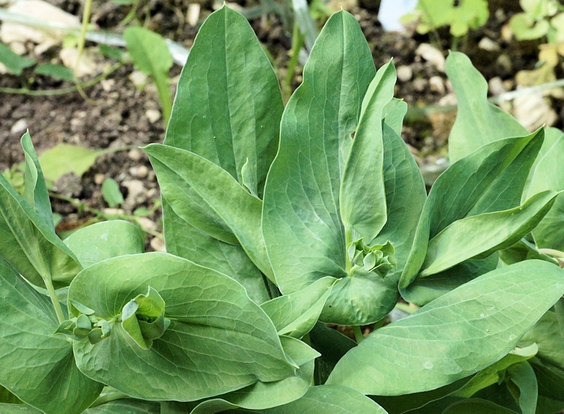 - feuilles perfoliées, plus allongées, ovales-oblongues, sensiblement atténuées de la base au sommet, obtuses, mucronulées, à nervures rayonnantes saillantes