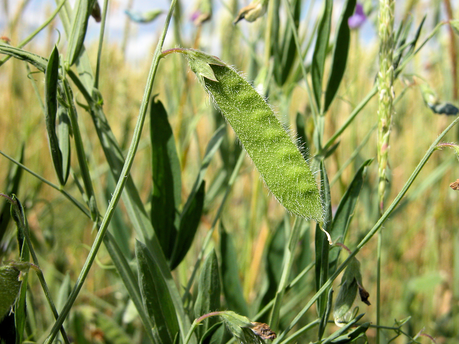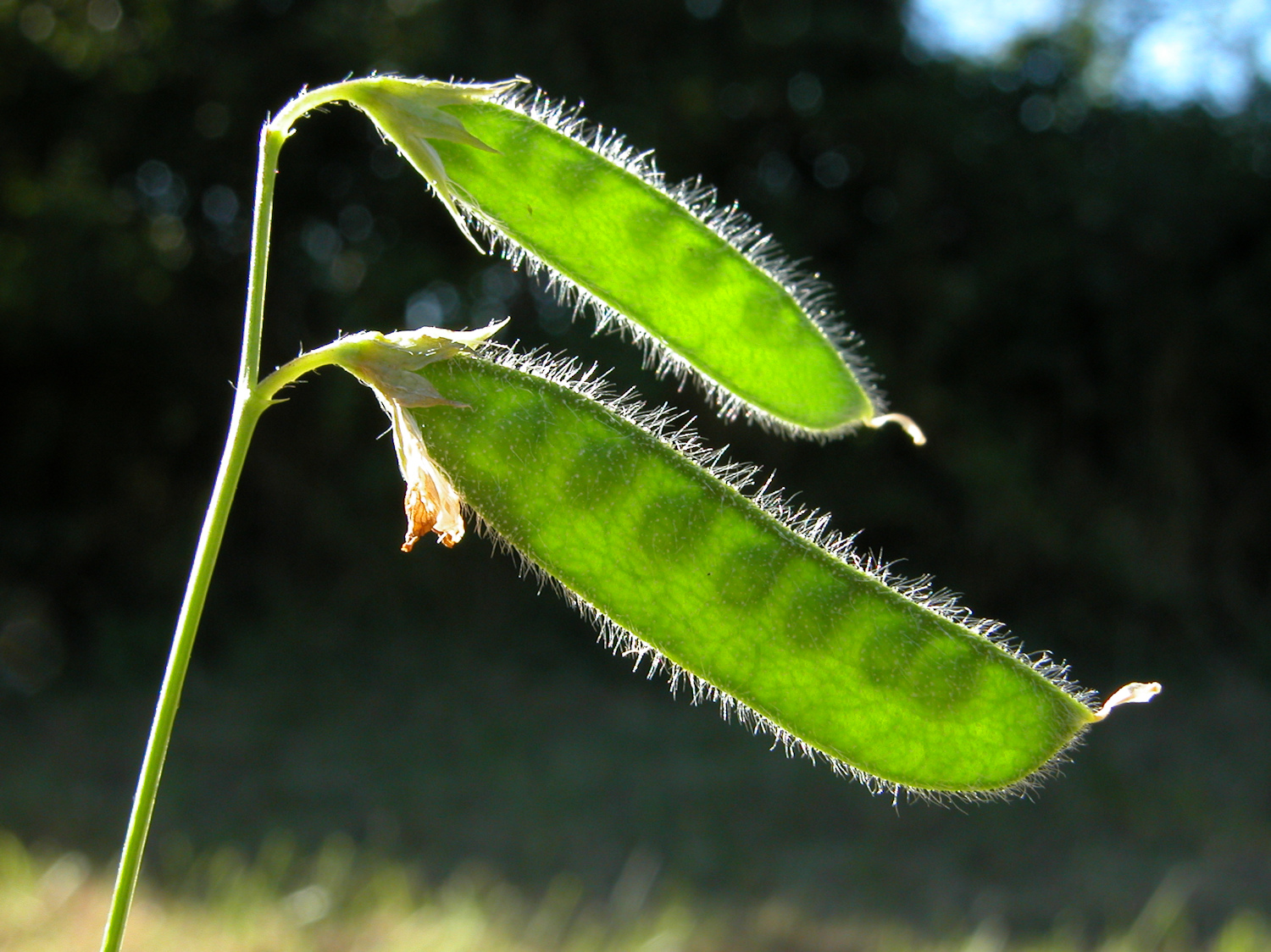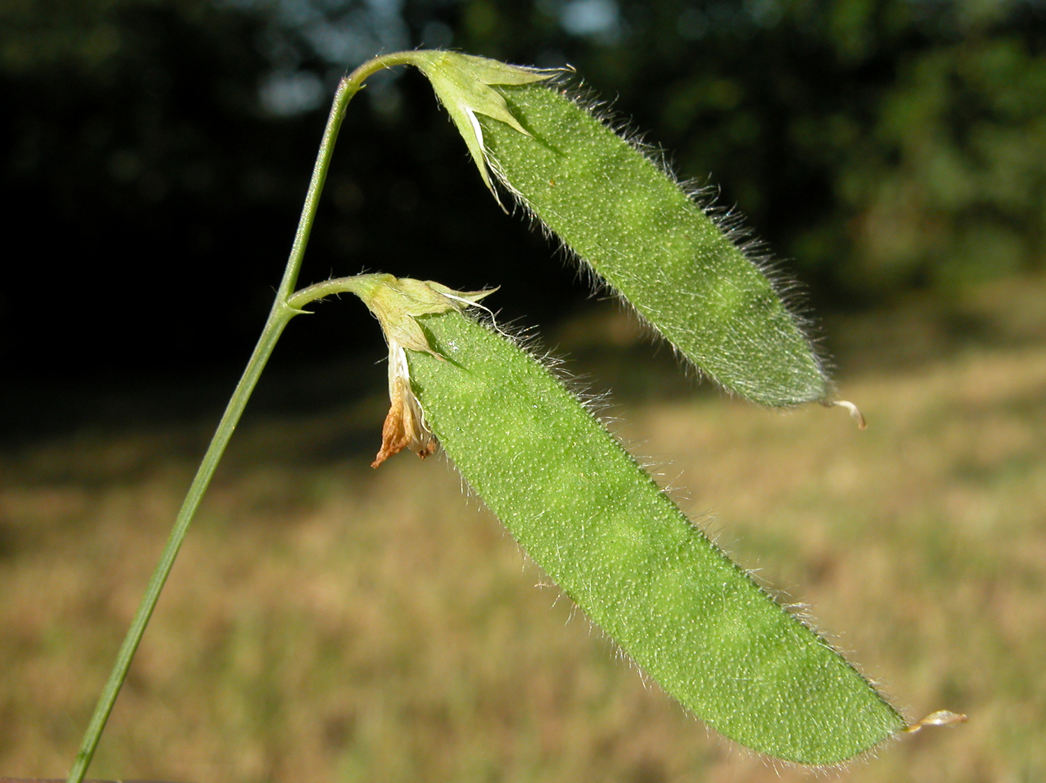 - gousses de 3-4 cm sur 7-8 mm, largement linéaires, un peu renflées, carénées sur le dos, hérissées de poils tuberculeux à la base, à graines globuleuses.