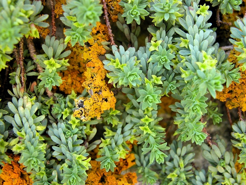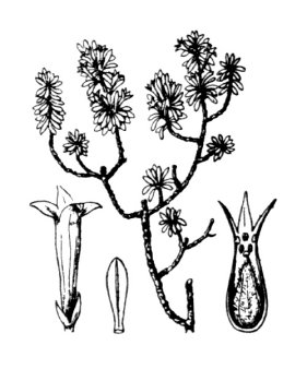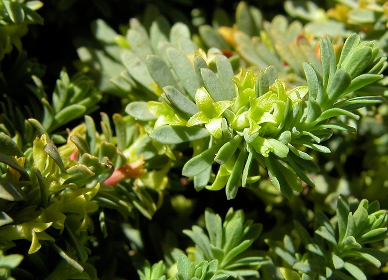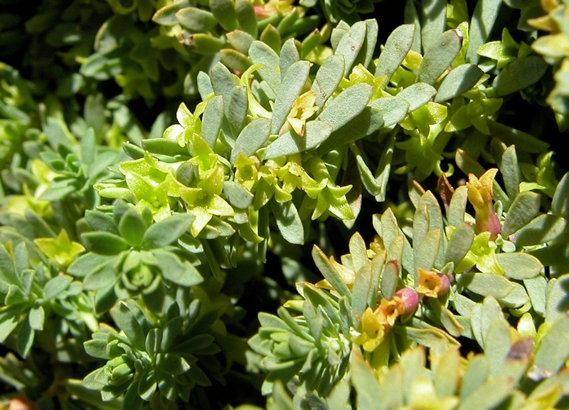 - feuilles petites (environ 5 mm de long sur 1 de large), très serrées, étalées, linéaires-spatulées, obtuses, herbacées, planes, uninervées